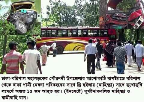 গৌরনদী হাইওয়ে থানার ভারপ্রাপ্ত কর্মকর্তা (ওসি) মো. আতিয়ার রহমান শেখ জানান, সকালে বরিশাল থেকে ঢাকাগামী মেঘনা পরিবহনের যাত্রীবাহী একটি বাস আশোকাঠি বাসস্ট্যান্ডের কাছে এলে বিপরীত দিক থেকে আসা থ্রি হুইলালের (মাহিন্দ্রা) সঙ্গে মুখোমুখি সংঘর্ষ হয়। এ সময় উভয় পরিবহনের অন্তত ১৫ জন আহত হন। তাদের উদ্ধার করে গৌরনদী স্বাস্থ্য কমপ্লেক্সে ভর্তি করা হয়েছে।
